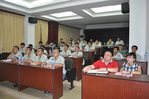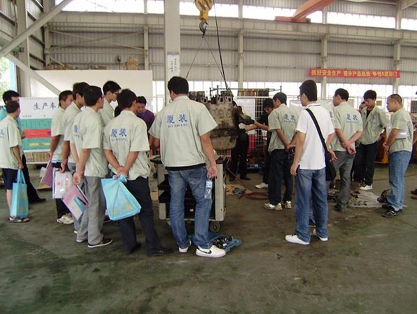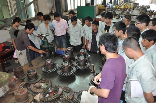 本次研討學(xué)習(xí)班共有來(lái)自全國(guó)各地區(qū)共計(jì)40名的一線(xiàn)服務(wù)人員參加。此次學(xué)習(xí)班,引起我司領(lǐng)導(dǎo)高度重視,不僅組織了相關(guān)部門(mén)領(lǐng)導(dǎo)系統(tǒng)授課:從新品介紹到各個(gè)機(jī)型的特點(diǎn),從發(fā)動(dòng)機(jī)故障判斷維修到管路液壓件原理介紹,從制動(dòng)系統(tǒng)學(xué)習(xí)到油缸的拆裝;而且與相關(guān)配套廠(chǎng)商協(xié)商,組織全體學(xué)員到相應(yīng)的工廠(chǎng)系統(tǒng)學(xué)習(xí)驅(qū)動(dòng)橋、變速箱、變矩器等主要零配件安裝維護(hù)課程!